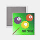 A cool design featuring three colourful pool balls in purple, orange and yellow. A pool cue in the corner on a shaded green background. Calling all pool sharks.