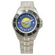 Has heft and feel of expensive stainless steel quartz watches. Good band with safety catch. I removed links, which is easy because engraved arrows show direction to push the linking pins. As always by this seller, the image (a railroad logo) is a perfect reproduction of my emailed image, and is precisely spaced and aligned.