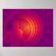 A vivid neon image with binary code and a bright sunburst and circles. In purple and orange and pink. An outline of a person seems to be consumed and absorbed by all the high technology / code moving towards the singularity represented by the bright sunburst in the background.