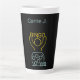 Personalised latte mug for bingo lovers, with neon yellow and blue Bingo Night line art graphics on black background.