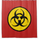 Red shower curtain with black and yellow biohazard warning symbol.