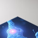 A highly detailed 3D render of a bioluminescent neuron featuring a flower-like soma with a glowing yellow and pink core. Radiant energy pathways extend along petal-shaped folds, while intricate dendrites branch into a dark blue space dotted with glowing bokeh particles. The scene exudes an ethereal, vibrant, and cinematic atmosphere.