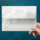 A soft and celebratory Chuppah wedding invitation envelope to match the invitation featuring a foggy forest woodland background with white birch trees, anemones, peonies and roses with silver dollar eucalyptus greenery, all in a soft white tone-on-tone opaque background.