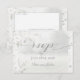 A soft and celebratory Chuppah wedding invitation RSVP featuring a foggy forest woodland background with white birch trees, white anemones, peonies, roses with silver dollar eucalyptus greenery, all is a soft tone on tone background. This RSVP offers a meal choice on the back and requests to be returned to you by mail.
