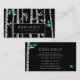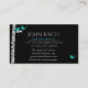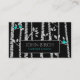 A business card with a modern yet rustic unique design has a black background populated with birch trees and falling leaves. Cute little turquoise blue birds and a pair of blue bird love pop against the black background.