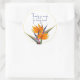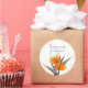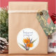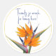 Wedding stickers with orange bird of paradise flowers. Customise blue script text, in modern handwritten font, to say "thank you" to guests for attending the wedding. Round stickers come in two sizes. Add to favour packages at the reception, shower, or other event. This design is meant for the round sticker shape, but may work on other shapes. Do not let text get near edges!