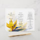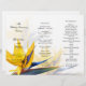 Bird of paradise wedding program to fold into thirds.  Pretty, exotic yellow flowers decorate paper with three sections of text templates.  The paper will be folded (by the customer) accordion style with a front, middle and last page.  Text is black with a title, names, location and date on the front.  The middle section is for the ceremony order and the last page is for listing the officiant, parents, and wedding party.