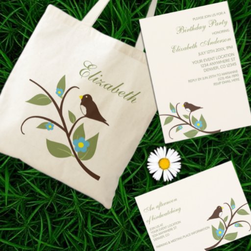Bird birthday collection featuring a brown bird on a tree branch amidst leaves and bright blue flowers