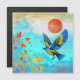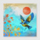 This gorgeous design depicts a blue and gold bird makng a landing on a golden tree with a beautiful sky of many blue colours and a bold orange sun.