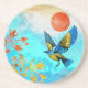 This gorgeous design depicts a blue and gold bird makng a landing on a golden tree with a beautiful sky of many blue colours and a bold orange sun.
