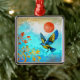This gorgeous design depicts a blue and gold bird makng a landing on a golden tree with a beautiful sky of many blue colours and a bold orange sun.