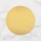 This table confetti has large circles that are black with a bird on a branch overlooking a winter scene of a cabin by a stream in the snow in a gold birdcage. Medium circles are gold, small circles are black.