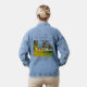 This women's jean jacket displays a row of colourful birdhouses basking in the spring sunshine. A yellow forsythia bush, trees, blue sky, and green grass frame the row of unique birdhouses. Show your love for feathered friends and their birdhouses.