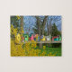 This adorable jigsaw puzzle shows a row of colourful birdhouses basking in the spring sunshine. A yellow forsythia bush, trees, blue sky and green grass frame the row of unique birdhouses.