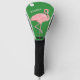 Fun golf club cover done in green, with graphics of a pink flamingo and golf ball. White text reads birdie. Matching golfing products are available.