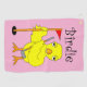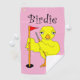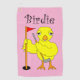 Birdie in curly text with a yellow chick holding a golf club and the flag in a golf hole is a funny gift design for golfers.