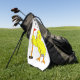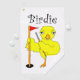 Birdie in curly text with a yellow chick holding a golf club and the flag in a golf hole is a funny gift design for golfers.