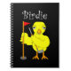 Birdie in curly text with a yellow chick holding a golf club and the flag in a golf hole is a funny gift design for golfers.