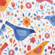 Bright watercolor yellow blue and red birds and flowers on a white background. Original art by Nic Squirrell.