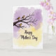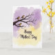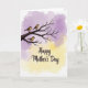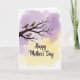 This design shows a dark, graceful tree branch reaching in from the left and curving across the upper middle of the card. Three small birds in warm ochre and soft brown sit close together on the branch, facing right as if sharing a quiet moment ❤️. Their tiny bodies have light texture, and the way they lean toward the same view suggests a calm bond, like friends watching the sky side by side. Behind them, a watery gradient shifts from lavender and soft violet near the top down into a mellow, buttery yellow near the bottom, like early morning or late evening light. The smooth, flowing background makes the branch and birds feel even more still and steady, like they’re gently holding the scene in place. Near the lower area, a short message appears in dark lettering, centered and easy to notice against the pale wash 🌼. The branch is a deep brown-black silhouette, and the three birds are spaced evenly along it with small gaps between them.