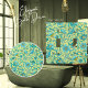 Beautiful ceramic pull with birds, florals in deep royal blue backed in yellow (bath towel set and bath mat also available in with florals, birds, motifs backed in brilliant shade of yellow trimmed in aqua and tan). Unique vibrant design great for guest baths, or for special occasions weddings, showers etc. We have a great supply of towels from classics to eclectic to suite all.