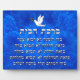Text of the Birkat Habayit(ברכת הבית), Hebrew for "Blessing for the Home", superimposed on a blue and white fractal image reminiscent of feathers or clouds. A small Star of David (Magen David) is located in the center of the fractal and a white dove carrying a sprig of olive branch also appears.