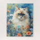 Colourful watercolor artwork of a Birman Cat sitting in a field of spring flowers.