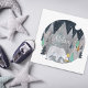 Introducing little baby boy announcement with a cute bear walking in the mountains woodland forest under the moon. Original artwork by Caroline Bonne Müller