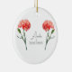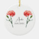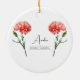 The birth month flower January Carnation ornament features a beautiful illustration of a carnation flower. Below the flower, there's a customisable name written in elegant script font. Underneath the name, it says "January - Carnation", indicating that her birth flower is the carnation. It's a lovely personalised ornament, a thoughtful gift for someone born in January.
