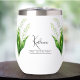 Featuring an illustration of lily of the valley flowers. Below the flowers, the name is written in a graceful script font. Beneath the name, it states "May - Lily of the Valley," indicating that her birth month is May and her birth flower is the lily of the valley. It is a personalised wine tumbler, customised as a thoughtful gift for someone born in May.