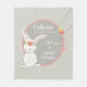 Cute birth stats fleece blanket with a little bunny and a flower pattern in the background. Beautiful personalised gift for new baby girls.