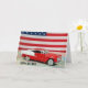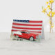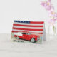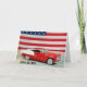 Old red and white 1955 Chevy car on a road map with American flag background for birthday.