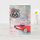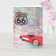 Retro red and white corvette on road map with Route 66 sign for birthday.