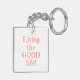 This double-sided key chain design features a "55 and fabulous" birthday celebration over a coral glitter bokeh background. The number 55 dominates the top of the design while fabulous, is in all caps and curved along the bottom. The back has template text "Living the GOOD life!". Personalise the text, remove the text or click customise to select a typeface style, size, and colour you prefer.