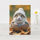 A cute hamster is snugly wrapped in a knitted hat and scarf, sitting in a walnut shell surrounded by autumn leaves.