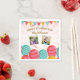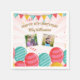 Fun, festive birthday paper napkins featuring pink, gold and green balloons, streamers and confetti, your 2 photos and 2 lines of custom text. Colourful, spirited and classic - perfect birthday napkins for kids and adults.