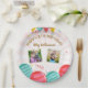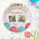 Fun, festive birthday paper plates for any age featuring pink, gold and green balloons, streamers and confetti, your 2 photos and 2 lines of custom text. Colorful, spirited and classic - the perfect plates for kids and adults.
