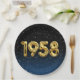 Gold foil balloons for 1958 birth year on gradient black and blue background with night stars for birthday party.