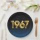 Gold foil balloons for 1967 birth year on gradient black and blue background with night stars for birthday party.