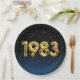 Gold mylar birthday balloons for 1983 birthday on gradient black and blue background with night stars.