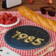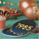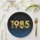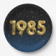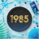 Gold mylar birthday balloons for 1985 birthday on gradient black and blue background with night stars.