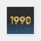Gold mylar birthday balloons for 1990 birthday on gradient black and blue background with night stars.