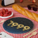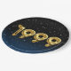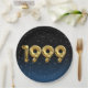 Gold foil balloons for 1999 birth year on gradient black and blue background with night stars for birthday party.
