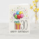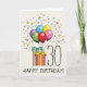Destei's original birthday theme design featuring colourful birthday balloons and two present boxes wrapped with pretty bows. The design is framed by cheerful confetti made out of stars and dots. The colour scheme includes colours such as red, pink, blue, yellow, purple, teal, and beige. There are also two personalizable text areas where one is meant for the person's age and another is meant for custom text. The custom text area now reads: "Happy Birthday!".