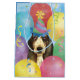 Happy birthday greetings with this cute design featuring a cute, party hat-wearing Basset Hound puppy surrounded by colorful balloons, confetti and streamers.