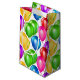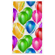 Paper gift bag is shown in a white colour with a glossy finish with a colourful festive birthday balloons print.