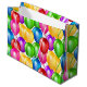 Paper gift bag is shown in a white colour with a glossy finish with a colourful festive birthday balloons print.