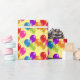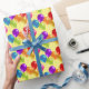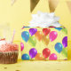 This wrapping paper is shown in a colourful birthday balloons print design.