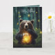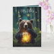Big black bear in a dark forest with a glass jar filled with fireflies for birthday.
