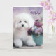 Soft and feminine lavender, violet and purple hues create a sweet birthday card for the pet mom or dog lover of the Bichon Frise breed.